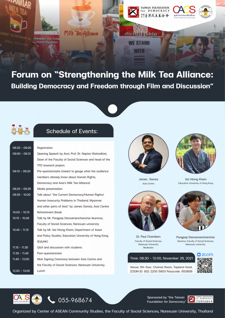 Forum on “Strengthening the Milk Tea Alliance: Building Democracy and Freedom through Film and Discussion” Forum on “Strengthening the Milk Tea Alliance:Building Democracy and Freedom through Film and Discussion” Time: 08.30 – 13:00, November 26, 2021Venue: 5th floor, Chainat Room, Topland Hotel, Phitsanulok Join Zoom Meeting ZOOM ID: 932 2205 5903Passcode: 653858