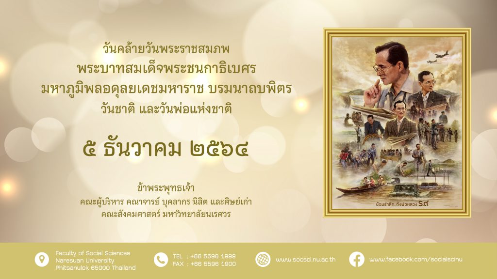 วันคล้ายวันเฉลิมพระชนมพรรษาพระบาทสมเด็จพระชนกาธิเบศร มหาภูมิพลอดุลยเดชมหาราช บรมนาถบพิตร ๕ ธันวาคม ๒๕๖๔วันคล้ายวันพระราชสมภพพระบาทสมเด็จพระชนกาธิเบศรมหาภูมิพลอดุลยเดชมหาราช บรมนาถบพิตรวันชาติ และวันพ่อแห่งชาติ ข้าพระพุทธเจ้าคณะผู้บริหาร คณาจารย์ บุคลากร นิสิต และศิษย์เก่าคณะสังคมศาสตร์ มหาวิทยาลัยนเรศวร