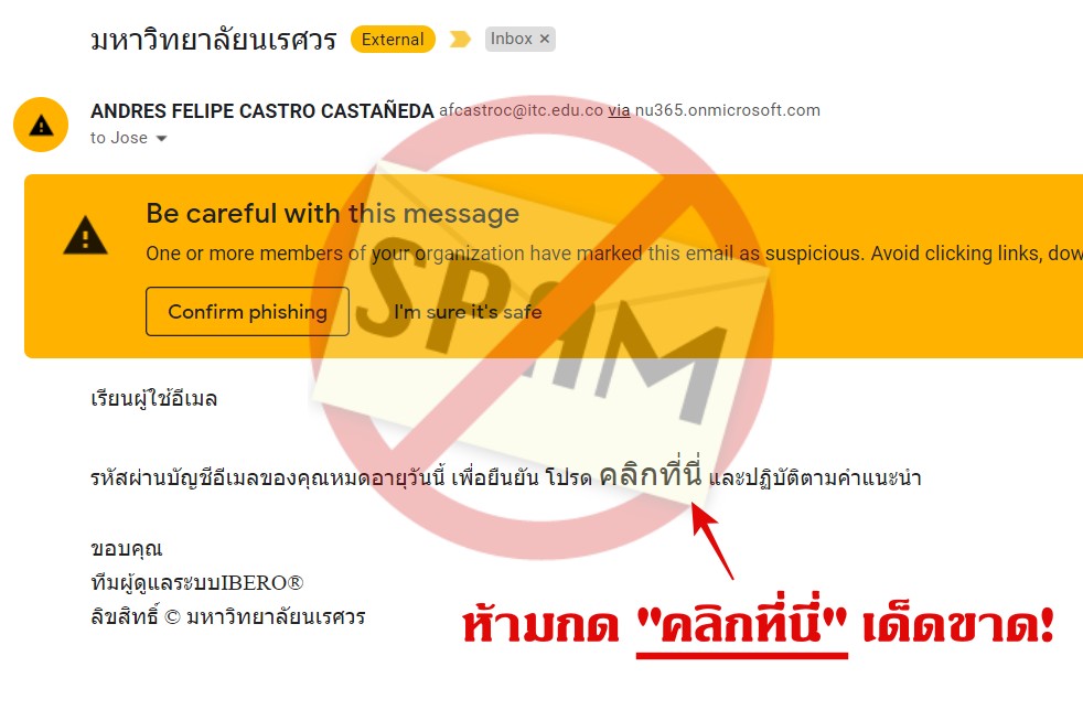 หากท่านได้รับ Spam Mail ลักษณะนี้ ในกล่องรับเข้าของ NU Mail ให้ทำการลบทิ้งทันที