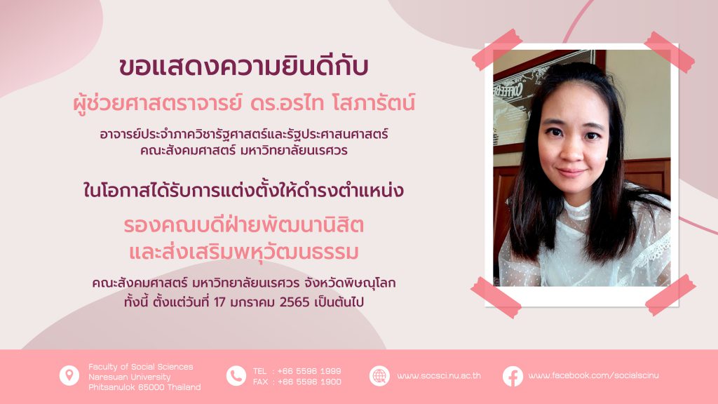 ขอแสดงความยินดีกับ ผู้ช่วยศาสตราจารย์ ดร.อรไท โสภารัตน์ ในโอกาสได้รับการแต่งตั้งให้ดำรงตำแหน่ง รองคณบดีฝ่ายพัฒนานิสิตและส่งเสริมพหุวัฒนธรรม
