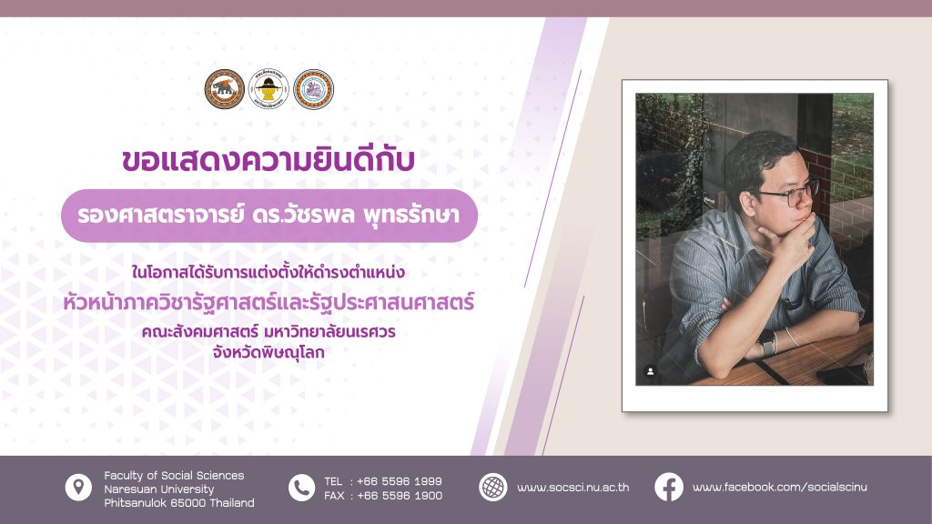 ขอแสดงความยินดีกับ รองศาสตราจารย์ ดร.วัชรพล พุทธรักษา ในโอกาสได้รับการแต่งตั้งให้ดำรงตำแหน่ง หัวหน้าภาควิชารัฐศาสตร์และรัฐประศาสนศาสตร์ คณะสังคมศาสตร์ มหาวิทยาลัยนเรศวร จังหวัดพิษณุโลก