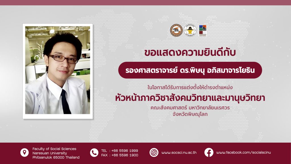 ขอแสดงความยินดีกับ รองศาสตราจารย์ ดร.พิษนุ อภิสมาจารโยธิน ในโอกาสได้รับการแต่งตั้งให้ดำรงตำแหน่ง หัวหน้าภาควิชาสังคมวิทยาและมานุษวิทยา