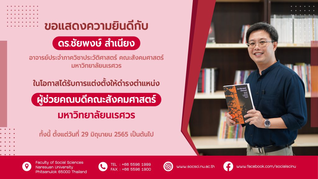 ขอแสดงความยินดีกับ ดร.ชัยพงษ์ สำเนียงในโอกาสได้รับการแต่งตั้งให้ดำรงตำแหน่ง ผู้ช่วยคณบดีคณะสังคมศาสตร์ มหาวิทยาลัยนเรศวร ขอแสดงความยินดีกับ ดร.ชัยพงษ์ สำเนียง อาจารย์ประจำภาควิชาประวัติศาสตร์ คณะสังคมศาสตร์ มหาวิทยาลัยนเรศวร ในโอกาสได้รับการแต่งตั้งให้ดำรงตำแหน่ง ผู้ช่วยคณบดีคณะสังคมศาสตร์ มหาวิทยาลัยนเรศวร ทั้งนี้ ตั้งแต่วันที่ 29 มิถุนายน 2565 เป็นต้นไป
