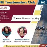 SOCSCI@NU-Thailand is inviting you to Naresuan Toastmasters Club’s 102 nd meetingTheme: “Momentum May”Time: thursday 8 May 2025, From 5.30 PM to 6.30 PM Hybrid Meeting via ZoomVenue: Rajapruek 1, FSS, NU Zoom Meeting ID: 827 600 6102Passcode: fssnu ————————– คณะสังคมศาสตร์ Read more