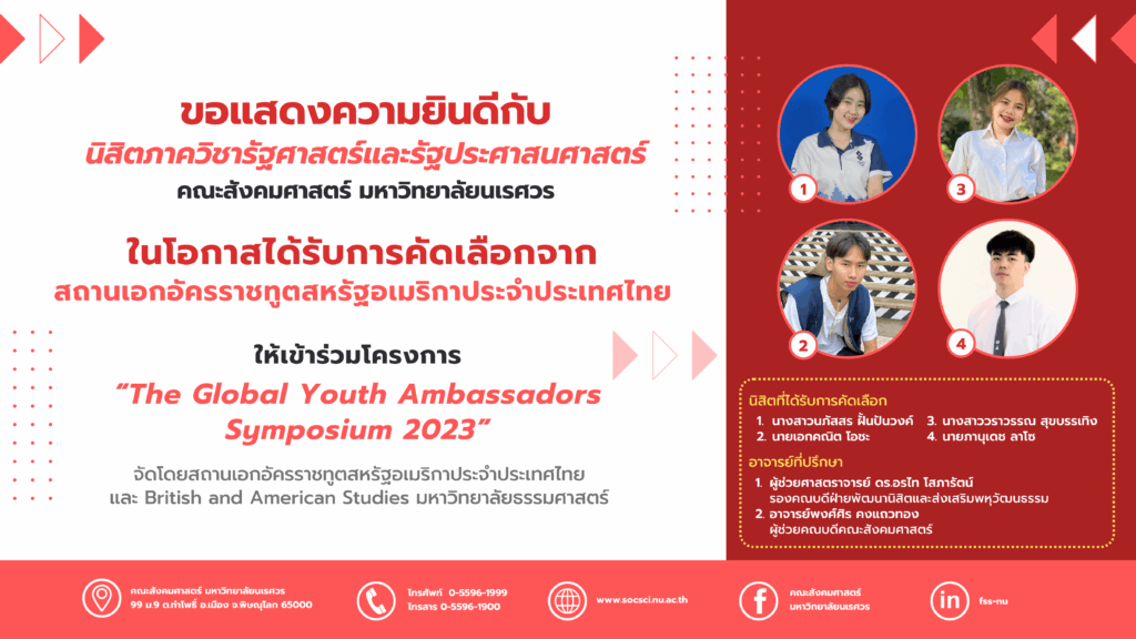 ขอแสดงความยินดีกับ นิสิตภาควิชารัฐศาสตร์และรัฐประศาสนศาสตร์ คณะสังคมศาสตร์ มหาวิทยาลัยนเรศวร ในโอกาสได้รับการคัดเลือกจาก สถานเอกอัครราชทูตสหรัฐอเมริกาประจำประเทศไทย ให้เข้าร่วมโครงการ “The Global Youth Ambassadors Symposium 2023”