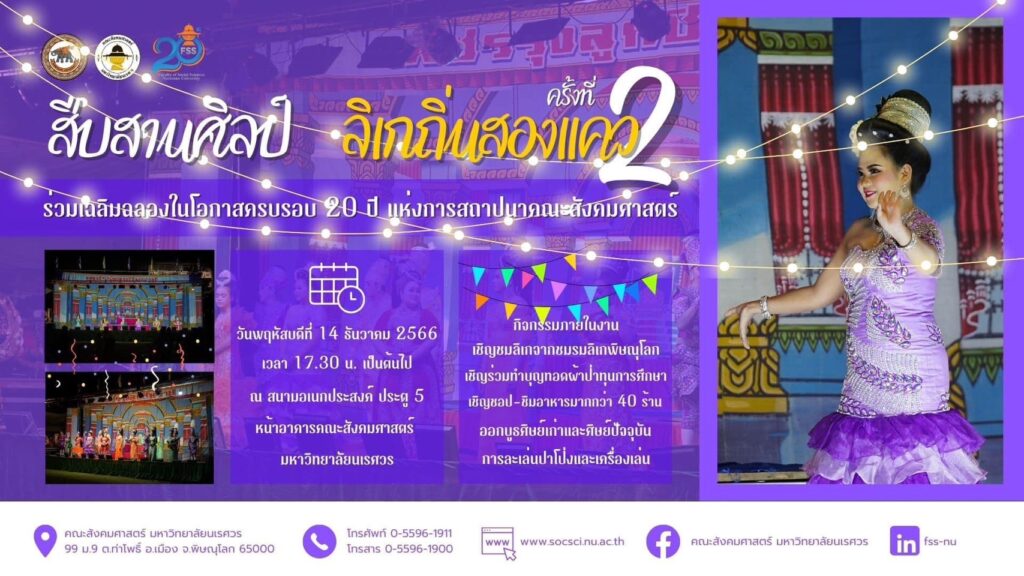 คณะสังคมศาสตร์ มหาวิทยาลัยนเรศวร ขอเชิญชวนร่วมเฉลิมฉลองในโอกาสครบรอบ 20 ปี แห่งการสถาปนาคณะสังคมศาสตร์ ภายใต้ชื่องาน