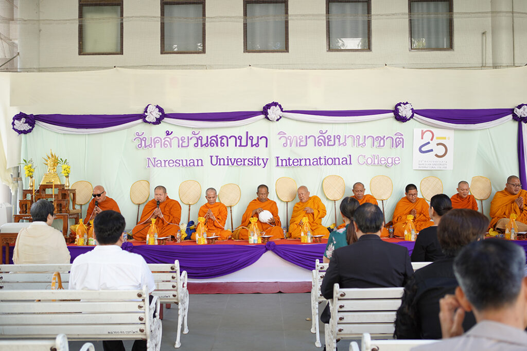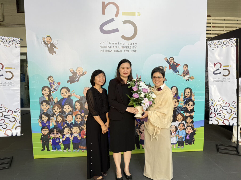 ดร.พุธิธาดา เดชพิทักษ์ รองคณบดีฝ่ายบริหาร คณะสังคมศาสตร์ มหาวิทยาลัยนเรศวร มอบแจกันดอกไม้เพื่อแสดงความยินดีในโอกาสวันคล้ายวันสถาปนาวิทยาลัยนานาชาติ ครบรอบ 25 ปี โดยรองศาสตราจารย์ ดร.สิริมาส เฮงรัศมี ผู้อำนวยการวิทยาลัยนานาชาติ มหาวิทยาลัยนเรศวร เป็นผู้รับมอบ ทังนี้จัดขึ้นในวันจันทร์ที่ 26 มกราคม 2569 เวลา 8.45 น. ที่ผ่านมา ณ บริเวณชั้น 1 อาคารวิทยาลัยนานาชาติ มหาวิทยาลัยนเรศวร