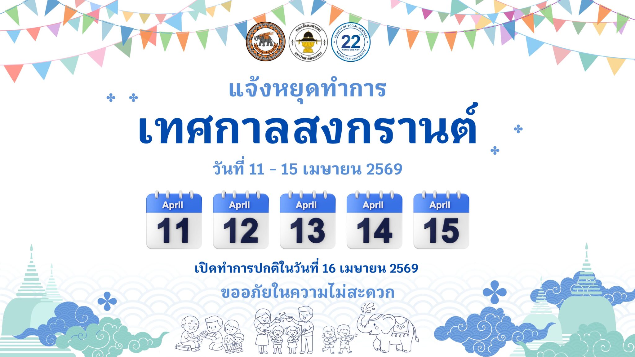 คณะสังคมศาสตร์ มหาวิทยาลัยนเรศวร ขอแจ้งหยุดทำการ “เทศกาลสงกรานต์” ระหว่างวันที่ 11 – 15 เมษายน 2569 เปิดทำการปกติในวันที่ 16 เมษายน 2569 ขออภัยในความไม่สะดวก