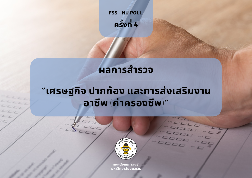 FSS – NU Poll ครั้งที่ 4 : สรุปผลสำรวจโพลในหัวข้อ “เศรษฐกิจ ปากท้อง และการส่งเสริมงานอาชีพ (ค่าครองชีพ)” FSS – NU Poll ครั้งที่ 4 สรุปผลสำรวจโพลในหัวข้อ “เศรษฐกิจ ปากท้อง และการส่งเสริมงานอาชีพ (ค่าครองชีพ)” แบบสำรวจครั้งนี้ เพื่อทำการสำรวจเกี่ยวกับ “เศรษฐกิจ ปากท้อง และการส่งเสริมงานอาชีพ (ค่าครองชีพ)” (เก็บข้อมูลตั้งแต่วันที่ 15 กรกฎาคม 2567 ถึง วันที่ 9 สิงหาคม 2567)