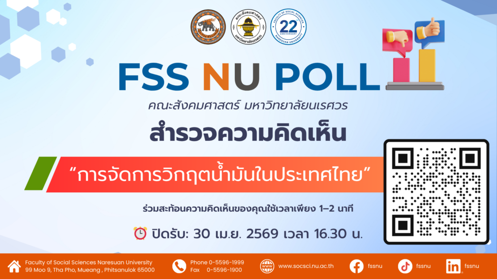 คณะสังคมศาสตร์ มหาวิทยาลัยนเรศวร ขอเชิญชวนประชาชนทั่วไป ร่วมเป็นส่วนหนึ่งในการสะท้อนความคิดเห็นผ่านแบบสำรวจ FSS NU POLL ภายใต้หัวข้อ