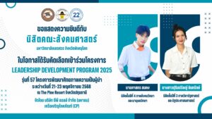 ขอแสดงความยินดีกับ นิสิตคณะสังคมศาสตร์ มหาวิทยาลัยนเรศวร จังหวัดพิษณุโลก ในโอกาสได้รับคัดเลือกเข้าร่วมโครงการ “LEADERSHIP DEVELOPMENT PROGRAM 2025” รุ่นที่ 57 โครงการพัฒนาศักยภาพความเป็นผู้นำ ระหว่างวันที่ 21-23 พฤศจิกายน 2568 ณ The Pine Resort จังหวัดปทุมธานี จัดโดย บริษัท ซีพี ออลล์ จำกัด (มหาชน) เครือเจริญโภคภัณฑ์ (CP) รายชื่อนิสิตที่ได้รับการคัดเลือก • นายภาสกร สนคง นิสิตชั้นปีที่ 4 ภาคสังคมวิทยาและมานุษยวิทยา • นางสาวปุริมปรัชญ์ อินทรักษ์ นิสิตชั้นปีที่ 3 ภาควิชารัฐศาสตร์และรัฐประศาสนศาสตร์