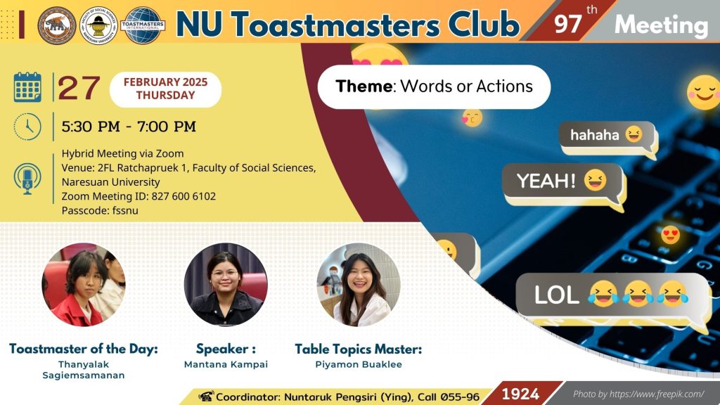 คณะสังคมศาสตร์ มหาวิทยาลัยนเรศวร ขอเชิญผู้สนใจทุกท่านร่วมโครงการ NU Toastmasters Club ครั้งที่ 97