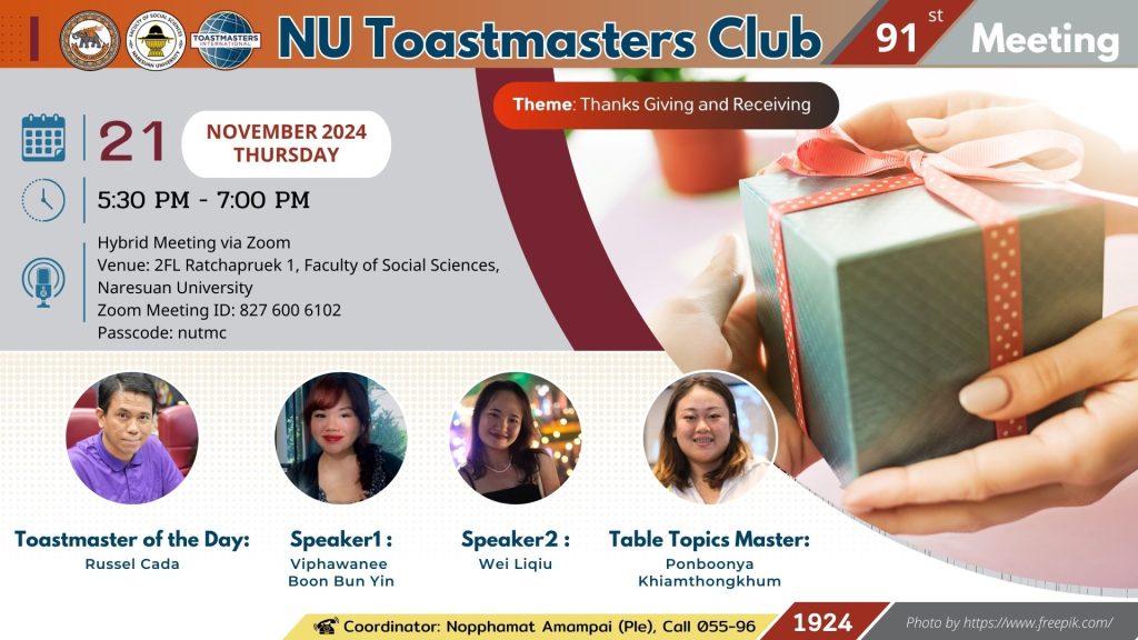 คณะสังคมศาสตร์ มหาวิทยาลัยนเรศวร ขอเชิญผู้สนใจทุกท่านร่วมโครงการ NU Toastmasters Club ครั้งที่ 91