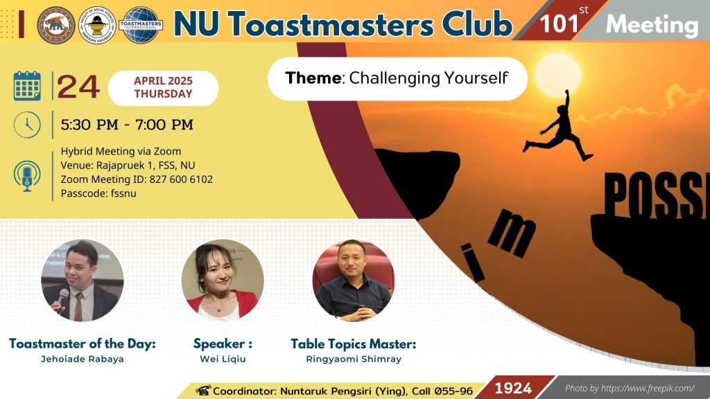 คณะสังคมศาสตร์ มหาวิทยาลัยนเรศวร ขอเชิญผู้สนใจทุกท่านร่วมโครงการ NU Toastmasters Club ครั้งที่ 101