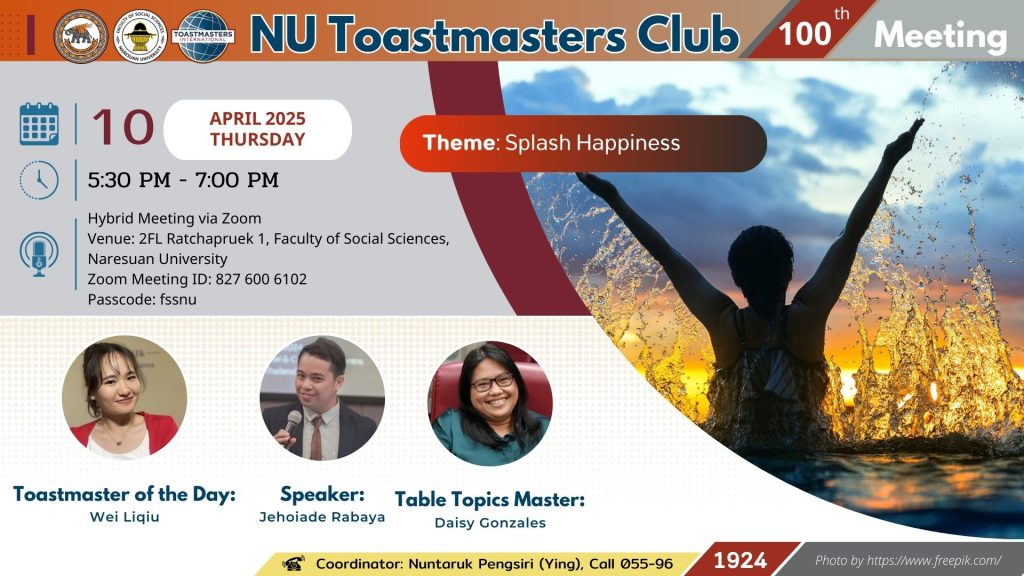 คณะสังคมศาสตร์ มหาวิทยาลัยนเรศวร ขอเชิญผู้สนใจทุกท่านร่วมโครงการ NU Toastmasters Club ครั้งที่ 100