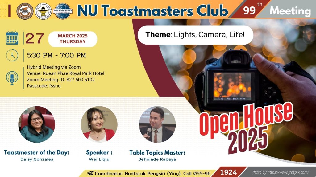 คณะสังคมศาสตร์ มหาวิทยาลัยนเรศวร ขอเชิญผู้สนใจทุกท่านร่วมโครงการ NU Toastmasters Club ครั้งที่ 99