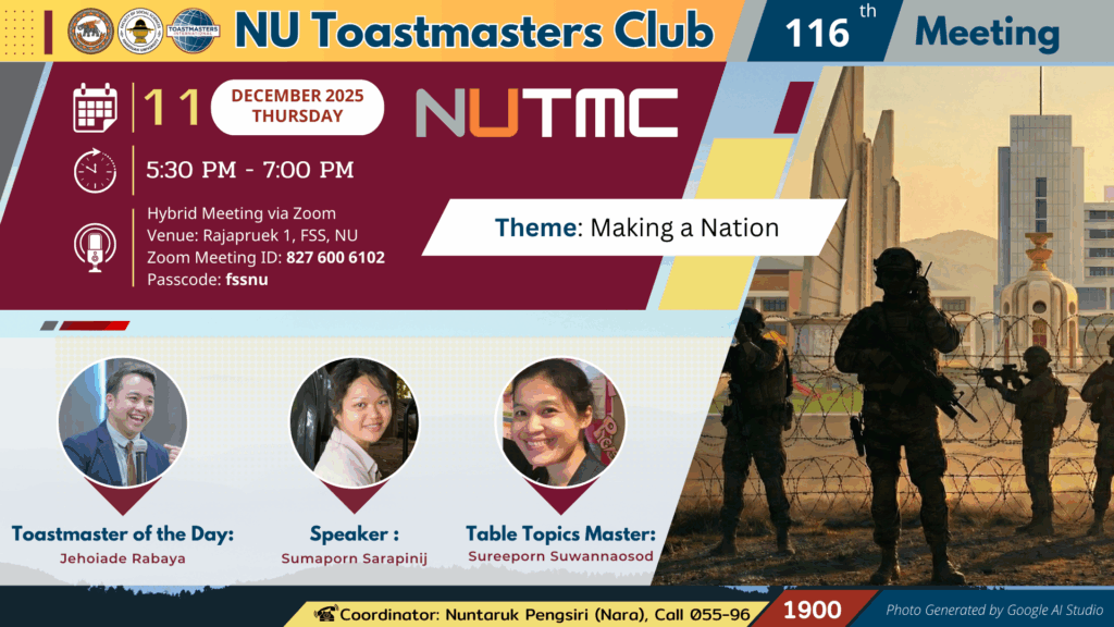 คณะสังคมศาสตร์ มหาวิทยาลัยนเรศวร ขอเชิญผู้สนใจทุกท่านร่วมโครงการ NU Toastmasters Club ครั้งที่ 116