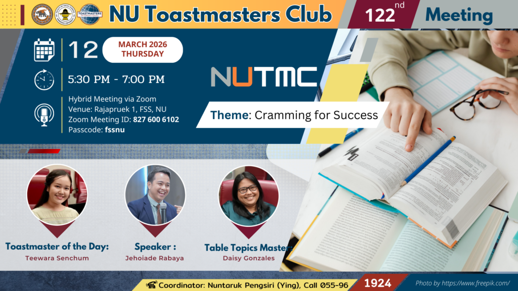 คณะสังคมศาสตร์ มหาวิทยาลัยนเรศวร ขอเชิญผู้สนใจทุกท่านร่วมโครงการ NU Toastmasters Club ครั้งที่ 122
