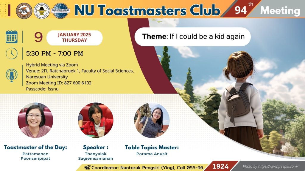 คณะสังคมศาสตร์ มหาวิทยาลัยนเรศวร ขอเชิญผู้สนใจทุกท่านร่วมโครงการ NU Toastmasters Club ครั้งที่ 94