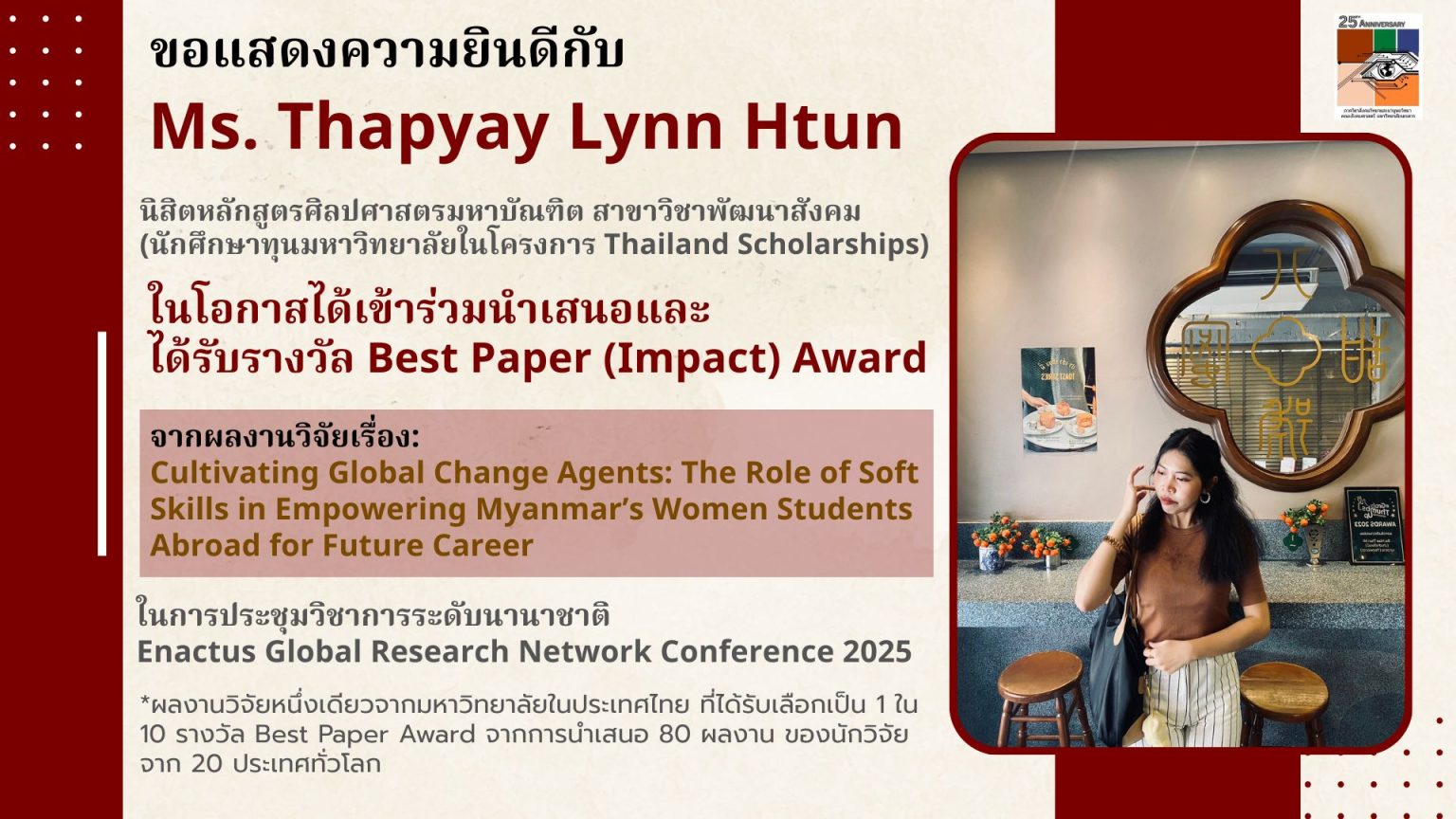 Ms. Thapyay Lynn Htun นิสิตหลักสูตรศิลปศาสตรมหาบัณฑิต (นักศึกษาทุน Thailand Scholarships) ที่ได้รับรางวัล Best Paper (Impact) Award จากผลงานวิจัยเรื่อง ” Cultivating Global Change Agents: The Role of Soft Skills in Empowering Myanmar’s Women Students Abroad for Future Career” ซึ่งผลงานของเธอได้รับคัดเลือกเป็น 1 ใน 10 รางวัลยอดเยี่ยม จากผลงานกว่า 80 ผลงานของนักวิจัยจาก 20 ประเทศทั่วโลก
